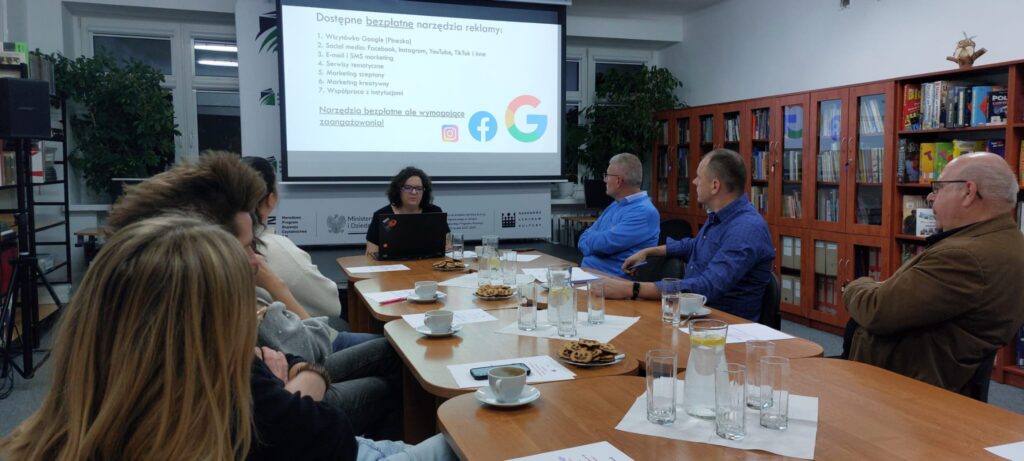 Podczas spotkania omawiane były główne źródła, z których możemy korzystać za darmo by promować swoją firmę, produkty i usługi. Są to między innymi social media, wizytówka w mapach google (o tym więcej TU) czy współpraca z innymi podmiotami (w tym NGO czy lokalne urzędy).